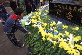 11月12日,一名學(xué)生在青川東河口地震遺址公園向遇難者獻(xiàn)花。