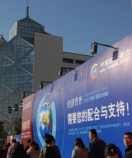 豎立在北京西單街頭有關第二次全國經(jīng)濟普查的大型宣傳牌引人注目(11月15日拍攝)。