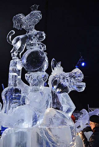 18日,在德國(guó)北部城市不來梅,一名俄羅斯藝術(shù)家在雕刻童話《不來梅的音樂家》的冰雕作品。大約40名雕刻者創(chuàng)作了28尊以格林童話為主題的冰雕作品。新華社/法新