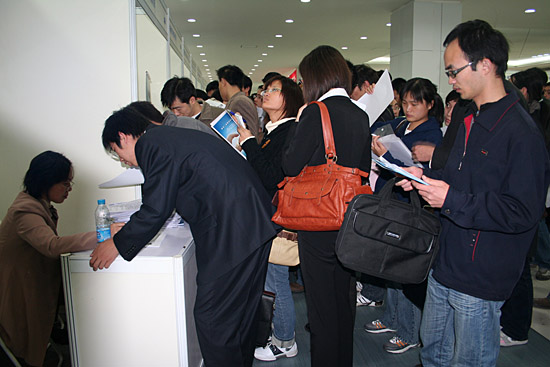 11月20日,上海交通大學(xué)2009屆畢業(yè)生國有重點(diǎn)單位專場招聘會(huì)現(xiàn)場,5000多名大學(xué)生爭取61家國有企業(yè)用人單位職位。受到金融危機(jī)牽連,許多應(yīng)屆大學(xué)畢業(yè)生把就業(yè)方向從外企轉(zhuǎn)向國企,國企招聘會(huì)現(xiàn)場火爆,就業(yè)競爭日益激烈。
