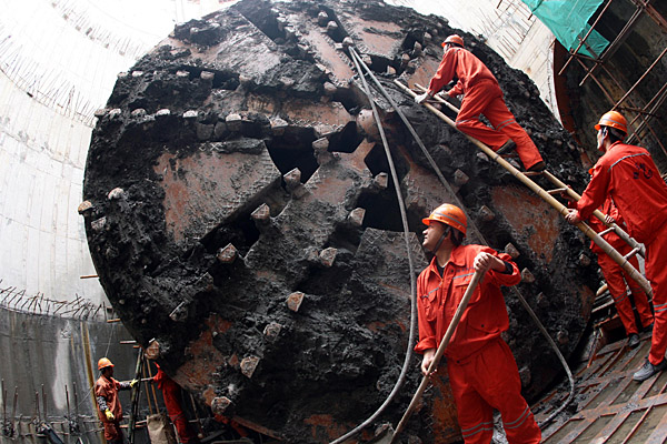 11月25日,隧道工人正在清理盾構(gòu)。 當(dāng)天,由上海隧道股份自行研發(fā)制造的國(guó)產(chǎn)盾構(gòu)順利進(jìn)入接收井,上海世博電力電纜隧道工程的首個(gè)盾構(gòu)區(qū)間勝利貫通。2010年上海世博會(huì)舉辦時(shí)間正好跨越了整個(gè)夏季,對(duì)于主辦地上海而言,夏季正是一年之中用電負(fù)荷最高的時(shí)期。為保障電力供應(yīng),多個(gè)與世博會(huì)息息相關(guān)的用電工程現(xiàn)正在建設(shè)中。上海世博電力電纜隧道全長(zhǎng)15.3公里,同時(shí)采用盾構(gòu)法、頂管法和明挖法分段施工。 | |