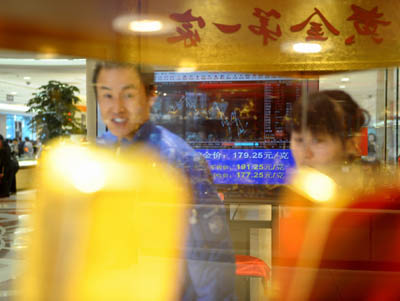 11月27日,兩名顧客從一家金店的櫥窗前走過。 2008年,北京市黃金飾品消費(fèi)火熱。據(jù)了解,北京市著名黃金珠寶首飾專營(yíng)公司菜百公司2008年1月到11月的銷售額已超33億元,而該公司2007年全年?duì)I業(yè)額為23.8億元。商務(wù)部的統(tǒng)計(jì)數(shù)據(jù)顯示,2008年上半年國(guó)內(nèi)金銀珠寶的消費(fèi)同比增長(zhǎng)41%,是商務(wù)部28大類監(jiān)測(cè)商品中增長(zhǎng)速度最快的行業(yè)。
