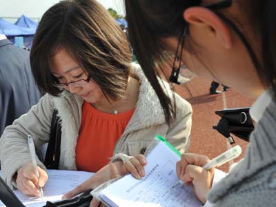 12月4日,高校畢業(yè)生在廣州大學城內的招聘會上填寫應聘材料。