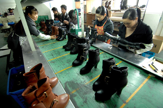 12月8日,浙江省溫嶺市冠奇鞋業(yè)有限公司的職工正在生產皮鞋。