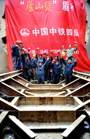12月8日,參加沈陽地鐵二號(hào)線工程建設(shè)的中國中鐵四局職工在“廬山號(hào)”盾構(gòu)機(jī)前歡呼。
