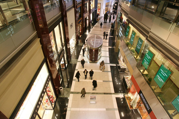 圖為12月7日客流稀少的紐約高檔購物城“時代華納中心”。越來越多的老百姓已經(jīng)轉(zhuǎn)向沃爾瑪?shù)攘畠r商場購物。