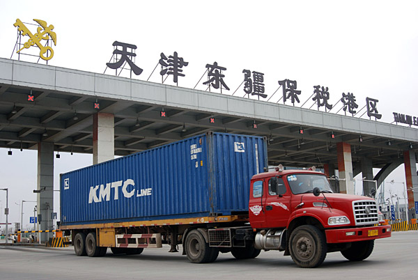 12月10日,一輛運輸集裝箱的貨車從天津東疆保稅港區(qū)駛出。