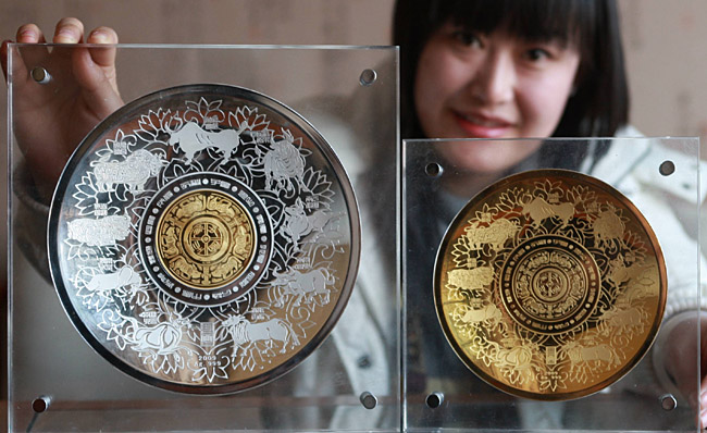 12月11日,在北京中國印鈔造幣總公司,一名工作人員展示牛年生肖賀歲金盤(右)和銀鑲金盤。