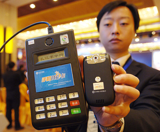 12月9日,移動公司的技術(shù)人員展示可使用“手機(jī)錢包”功能的手機(jī)及設(shè)備。