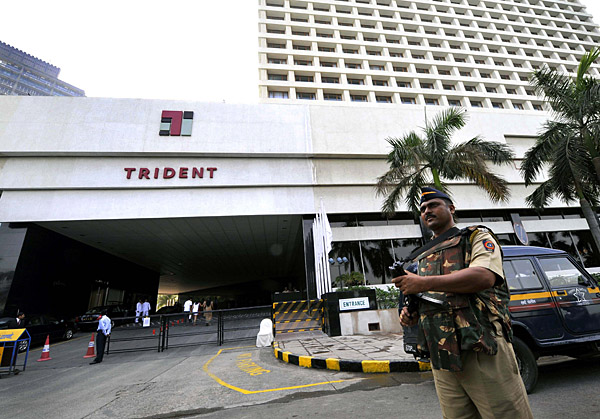 21日,一名武裝警察在印度孟買奧貝羅伊酒店的特里登特飯店外警戒。孟買的奧貝羅伊酒店由緊鄰的奧貝羅伊飯店和特里登特飯店組成,在孟買連環(huán)恐怖襲擊事件中曾是恐怖分子襲擊的主要目標。經(jīng)過20多天的整修,特里登特飯店于12月21日恢復營業(yè),而奧貝羅伊飯店因受損程度比較嚴重,還要經(jīng)過一段時間的修繕才能開業(yè)。