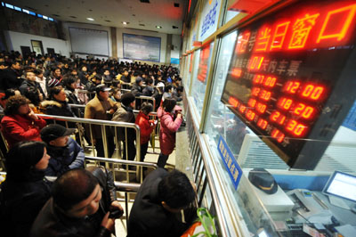 12月29日,旅客在合肥火車站售票大廳排隊購買車票。當日,合肥火車站2009年春運計劃和春運列車時刻表公布。春運期間,合肥火車站將突出安全、能力、秩序、服務、售票“五位一體”,采取增設購票窗口、增設旅客進站口、靈活開設和調(diào)整中轉旅客購票專窗及數(shù)量、加強服務等措施,最大限度滿足旅客出行需求。