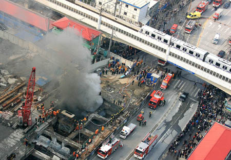 1月8日,一列地鐵列車正從火災(zāi)現(xiàn)場附近駛過。 當日11時30分左右,上海軌道交通11號線曹楊路工地位于地下20余米處發(fā)生火災(zāi),現(xiàn)場濃煙滾滾。到中午12時30分許,消防部門已經(jīng)從地下救出3名工人,并基本控制火勢。目前已發(fā)現(xiàn)1人死亡。經(jīng)初步確認,火災(zāi)是由乙炔爆燃引起的。目前,安監(jiān)、消防等部門正在調(diào)查這起事故的具體原因。