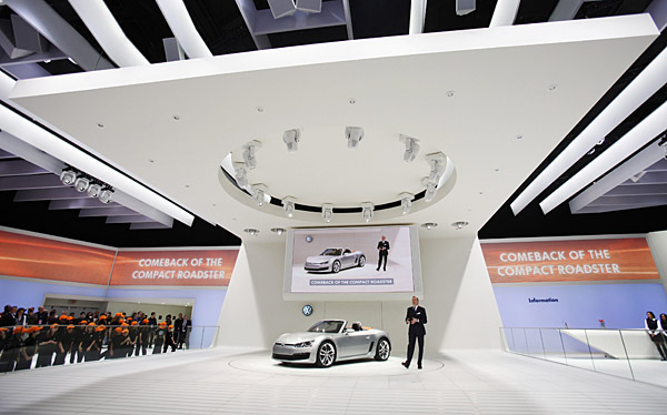 11日,在美國底特律舉行的北美國際車展上,大眾公司研發(fā)人員介紹大眾公司生產(chǎn)的概念跑車。2009北美國際車展當(dāng)日對媒體開放。由于經(jīng)濟(jì)危機(jī),三菱、日產(chǎn)、鈴木等汽車生產(chǎn)商沒有參加國際五大車展之一的北美國際車展。新華社/路透