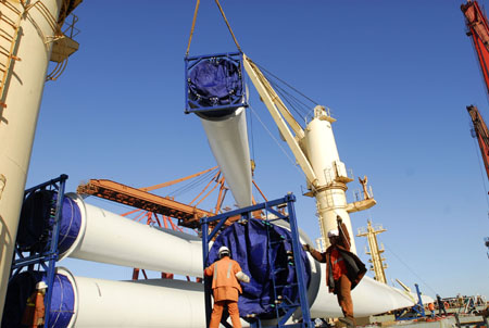 1月14日,一批由中國中材集團(tuán)公司自主研發(fā)制造的風(fēng)電設(shè)備從天津港裝船運(yùn)往印度。據(jù)了解,這批風(fēng)電設(shè)備共30套,葉片長度達(dá)到40.2米,單機(jī)容量達(dá)到1.5兆瓦。