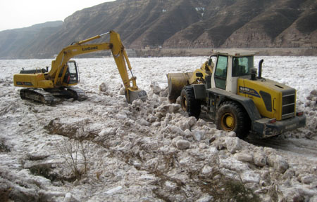 1月19日,搶險(xiǎn)人員駕駛挖掘機(jī)、推土機(jī)在黃河瀑布景區(qū)冰凌覆蓋的旅游公路上進(jìn)行破冰作業(yè)。 由于最近氣溫回升,黃河部分河段冰融,河水將冰頂起后又突然落下,形成壅塞,導(dǎo)致黃河壺口馬王廟村段突發(fā)冰凌災(zāi)害。 截至19日中午,黃河從壺口瀑布下游0.8公里處至壺口瀑布上游2.2公里堆積冰量達(dá)600萬(wàn)立方米左右,造成壺口至克難坡間3公里旅游道路無(wú)法通行,著名的黃河壺口瀑布景區(qū)已被關(guān)閉。 |