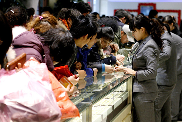 春節(jié)臨近,以黃金珠寶商品聞名的北京菜百公司迎來大批顧客。商家也適時推出多種黃金產(chǎn)品,以滿足消費者的需求。