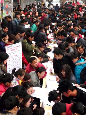 2月4日,招聘會現(xiàn)場擠滿眾多求職者。當(dāng)日,江西新余市2009年就業(yè)和再就業(yè)新春招聘大會開幕。本次招聘會勞動保障部門組織了200多家用人單位前來招聘,主要針對返鄉(xiāng)務(wù)工人員、就業(yè)困難人員和登記失業(yè)的大中專畢業(yè)生等。