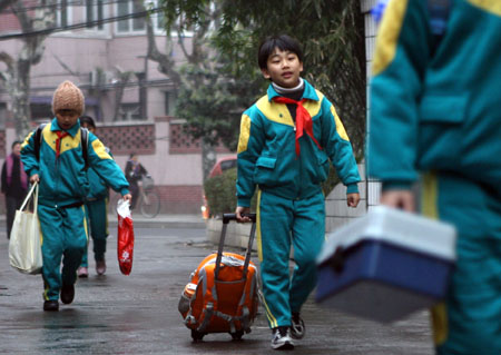 2月9日,上海市徐匯區(qū)高安路第一小學(xué)的學(xué)生們走在上學(xué)路上。 當(dāng)日,上海市160萬名中小學(xué)生正式開學(xué)。上海市各區(qū)縣教育局向社會(huì)作出新學(xué)期“減負(fù)”承諾:作業(yè)量“做減法”,課外活動(dòng)時(shí)間“做加法”;教師若“減負(fù)”不力,可能被調(diào)離工作崗位。同時(shí)公布的一系列“減負(fù)”具體措施包括:不讓教輔材料進(jìn)課堂,低年級(jí)學(xué)生無書面家庭作業(yè),每周五設(shè)為學(xué)生創(chuàng)新實(shí)踐日,布置給學(xué)生的作業(yè)教師必須先做一遍等。 |
