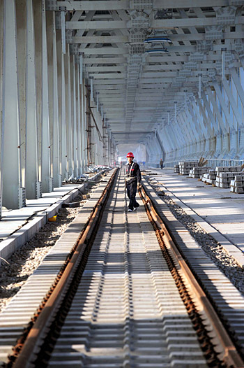 2月9日,武漢天興洲公鐵兩用長江大橋首條貨運鐵路線全線鋪通,為大橋2009年6月底通車奠定了堅實基礎(chǔ)。天興洲大橋共有4條鐵路線,首條貨運鐵路線鋪通后,火車可從江南或江北引橋運載施工物資、設(shè)備上正橋,這將使剩余3條鐵路線的鋪設(shè)速度大幅提高。