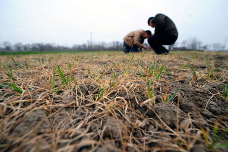 安徽省阜陽市插花鎮(zhèn)一處干旱的麥田里旱情嚴(yán)重。截至2月11日,河南、安徽、山東、河北、山西、陜西、甘肅、江蘇等主產(chǎn)區(qū)麥田受旱面積比高峰時下降了近四分之一,但目前仍有近40%的小麥?zhǔn)芎,抗旱形勢依然十分?yán)峻。