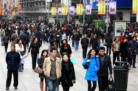 2月15日,上海市南京路上人流如織。日前公布的《2008年上海市國民經(jīng)濟(jì)和社會發(fā)展統(tǒng)計公報》顯示,至2008年末,上海全市常住人口總數(shù)達(dá)1888.46萬人。