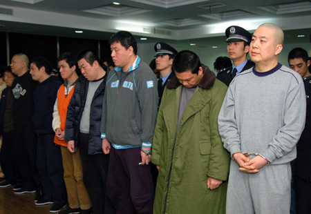 2月15日,被告人在法庭上。當(dāng)日,上海市普陀區(qū)人民法院對涉案金額高達(dá)60余億元的“上海網(wǎng)絡(luò)賭球第一案”的20名被告人進行一審宣判:以開設(shè)賭場罪判處主犯錢葆春有期徒刑6年,并處罰金500萬元;判處被告人溫翔霖有期徒刑5年,并處罰金101萬元;判處被告人鄒軍、劉必清、林興等18人有期徒刑2年8個月至1年不等,并處2萬-100萬元不等的罰金,其中朱春燕等5人因犯罪情節(jié)輕被判處緩刑。
