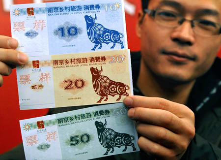 2月16日,工作人員在搖號(hào)儀式上展示3種“南京鄉(xiāng)村旅游消費(fèi)券”。 當(dāng)日,南京市舉行“南京鄉(xiāng)村旅游消費(fèi)券”發(fā)放搖號(hào)儀式,由12位市民代表?yè)u號(hào),從主城區(qū)89萬(wàn)多戶居民家庭中隨機(jī)產(chǎn)生了20萬(wàn)戶使用消費(fèi)券的家庭,每戶將可獲得100元的旅游消費(fèi)券。