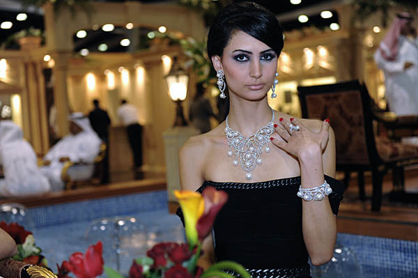 17日,一名模特展示今年流行款式的珍珠飾品。當(dāng)日,為期六天的第六屆多哈珠寶鐘表展在卡塔爾首都多哈的國(guó)際展覽中心開幕。據(jù)悉,此次參展的珠寶和鐘表總價(jià)值約20億美元。