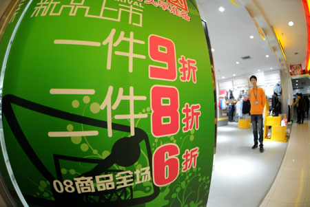 2月10日,沈陽一家體育用品專賣店,促銷宣傳廣告醒目。當日,國家統(tǒng)計局發(fā)布的數(shù)據(jù)顯示,1月份我國居民消費價格總水平(CPI)進一步回落、總體趨穩(wěn)。1月份CPI同比上漲1.0%,漲幅連續(xù)9個月呈回落態(tài)勢,與去年12月相比,CPI環(huán)比上漲了0.9%。新華社記者:李鋼