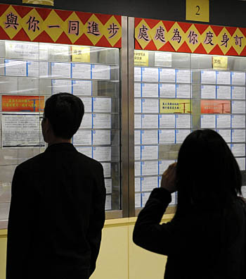2月17日,市民在勞工處職業(yè)招聘板前尋找工作。當(dāng)日,香港特區(qū)政府公布,受金融海嘯沖擊,到今年1月,香港失業(yè)率升至4.6%,并預(yù)期失業(yè)率在短期內(nèi)將繼續(xù)上升。