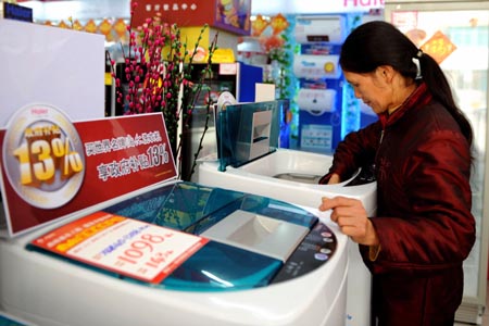 2月23日,廣西河池市金城江區(qū)一位農(nóng)婦在規(guī)定銷售網(wǎng)點(diǎn)選購(gòu)洗衣機(jī)。近期,隨著“家電下鄉(xiāng)”活動(dòng)的深入開展,廣西山村農(nóng)民紛紛到規(guī)定銷售網(wǎng)點(diǎn)購(gòu)買指定的家電產(chǎn)品。家電下鄉(xiāng)補(bǔ)貼政策不僅給農(nóng)村消費(fèi)者帶來(lái)了實(shí)惠,同時(shí)也成為商家創(chuàng)建品牌的良好商機(jī)。目前廣西家電下鄉(xiāng)銷售網(wǎng)點(diǎn)已達(dá)4000個(gè),企業(yè)投放的各類商品達(dá)到10萬(wàn)臺(tái),總價(jià)值2億元人民幣。 |