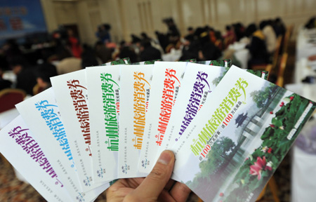 2月26日,在“杭州旅游消費券”新聞發(fā)布會上,工作人員正在展示杭州旅游消費券 。 當天,杭州舉行新聞發(fā)布會,介紹剛剛推出的“杭州旅游消費券”,本次杭州及下屬7縣市發(fā)放的旅游消費券共240萬套,總額為1.5億元,可以在指定商家使用,預計將在當?shù)乩瓌?0億元的旅游消費。杭州旅游消費券將通過媒體、網(wǎng)站、銀行、旅行社、行業(yè)協(xié)會等渠道向內地及港澳臺地區(qū)的旅游者發(fā)放,發(fā)放的截止時間為3月15日。