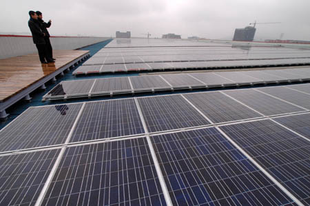 合肥太陽能光伏電站的光伏陣列(2009年3月2日攝)。3月1日,由合肥陽光電源有限公司自主建設的一座太陽能光伏電站在安徽合肥成功并網(wǎng)發(fā)電。該電站總裝機容量500千瓦,每年可發(fā)電60多萬千瓦時。