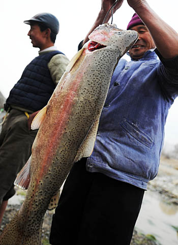青海省貴德縣的一名農民在展示捕撈到的一條重達4千克的虹鱒魚。