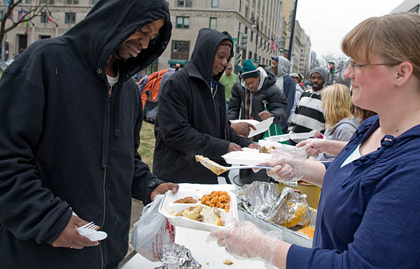 3月7日,在美國(guó)華盛頓,志愿者向無家可歸者分發(fā)食物。美國(guó)勞工部6日公布的數(shù)據(jù)顯示,今年2月份美國(guó)非農(nóng)業(yè)部門就業(yè)崗位減少65.1萬個(gè),失業(yè)率上升至8.1%,為1983年年底以來的最高水平。新華社/法新