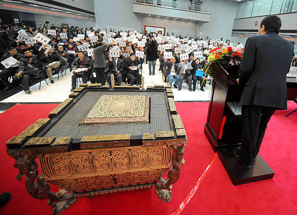 | 3月8日,“2008北京第29屆奧運(yùn)會(huì)開(kāi)幕式演出道具‘缶’專(zhuān)場(chǎng)拍賣(mài)會(huì)”在北京產(chǎn)權(quán)交易所落槌。首個(gè)標(biāo)的共十個(gè)缶以1.3萬(wàn)元總價(jià)起拍,經(jīng)過(guò)近百輪激烈競(jìng)價(jià),最終以70.6萬(wàn)元被347號(hào)買(mǎi)家競(jìng)得。據(jù)介紹,當(dāng)日有1000只缶約53個(gè)標(biāo)的投入競(jìng)拍,共有439家單位和個(gè)人報(bào)名參與了現(xiàn)場(chǎng)競(jìng)買(mǎi)。 | |