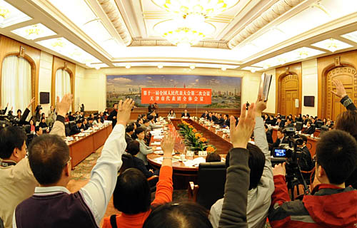 3月9日,出席十一屆全國人大二次會議的天津市代表團(tuán)在北京人民大會堂舉行全體會議,審議全國人大常委會工作報(bào)告。會后,部分代表接受集體采訪,中外媒體就天津?yàn)I海新區(qū)開放搞活、環(huán)渤海經(jīng)濟(jì)圈發(fā)展等問題提問。