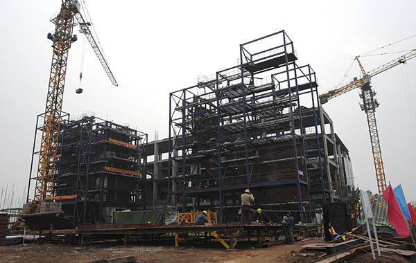 3月18日,施工人員在華能長(zhǎng)春生物質(zhì)熱電廠工地緊張施工。