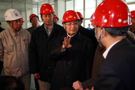 這是3月20日,溫家寶在鞍山鋼鐵集團公司同企業(yè)負責人商談應對金融危機的對策。 3月20日至22日,溫家寶在鞍山、沈陽、大連等地調研。3月20日下午,溫家寶在特變電工沈陽變壓器集團生產車間內,企業(yè)負責人張新告訴總理,面對金融危機,企業(yè)不減產反增產,不裁員反增員,不減薪反加薪,不減利稅反增利稅,預計今年銷售能增長50%以上。溫家寶聽后十分高興,他說:“沒有想到這家企業(yè)情況這么好。我現(xiàn)在最關心企業(yè)四件事情:生產、裁員、減薪、稅收,你們都創(chuàng)造了奇跡。雖然遇到國際金融危機的‘寒冬’,這里還是溫暖的! |