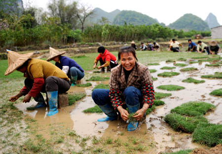 今年以來,廣西柳州市柳江縣農(nóng)民和部分返鄉(xiāng)民工一起通過發(fā)展種植城市綠化的馬尼拉草皮產(chǎn)業(yè),來化解外出務工難問題。新華社記者:張愛林