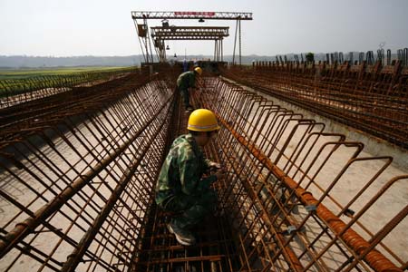 四川綿遂高速公路涪江特大橋加快建設。3月24日,建設者在綿遂高速公路涪江特大橋工地施工。新華社發(fā)(鐘敏