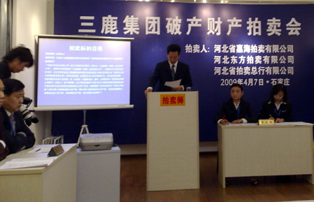 這是三鹿第二批破產(chǎn)財產(chǎn)拍賣會現(xiàn)場(4月7日攝)。當日,石家莊三鹿集團股份有限公司第二批破產(chǎn)財產(chǎn)在河北省嘉海拍賣有限公司進行了拍賣,河北貝蘭德乳業(yè)有限公司和石家莊君樂寶乳業(yè)有限公司成功回購了原屬三鹿的股權(quán)。