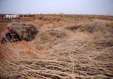 4月13日,在杭錦旗烏蘭鄉(xiāng),一位牧民正在源豐公司的收購點(diǎn)交售沙柳。 內(nèi)蒙古源豐投資有限公司2009年在內(nèi)蒙古杭錦旗庫布其沙漠和毛烏素沙漠種植沙柳11萬畝,利用沙柳資源發(fā)電,在開發(fā)“綠色電力”的同時帶動當(dāng)?shù)鼗哪卫怼?/P>