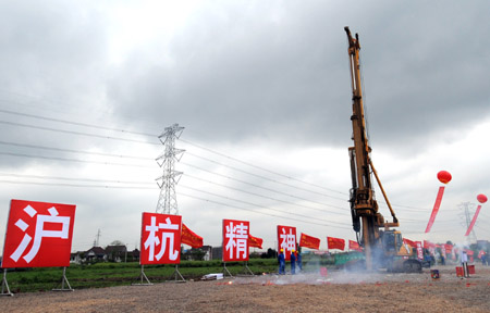 4月20日,在浙江嘉興市大橋村步云特大橋工地上,旋挖鉆機(jī)開(kāi)鉆滬杭鐵路客運(yùn)專(zhuān)線(xiàn)全線(xiàn)第一樁樁孔。滬杭鐵路客運(yùn)專(zhuān)線(xiàn)是國(guó)家鐵路“十一五”規(guī)劃中滬杭甬客運(yùn)專(zhuān)線(xiàn)的一部分,由上海虹橋站至杭州東站,線(xiàn)路長(zhǎng)158.5公里,設(shè)計(jì)時(shí)速每小時(shí)350公里,項(xiàng)目投資總額為276.3億元。預(yù)計(jì)2010年國(guó)慶通車(chē),屆時(shí)上海至杭州可在40分鐘內(nèi)到達(dá)。 |