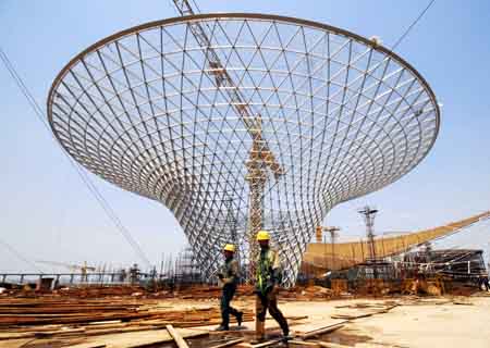 4月26日,施工人員在上海世博會(huì)主題館西展廳進(jìn)行內(nèi)部裝飾施工。目前,上海世博會(huì)主題館西展廳建成,進(jìn)入到內(nèi)部裝飾施工階段。世博會(huì)主題館西展廳南北跨180米,東西跨126米,矩形的超大跨度無柱空間創(chuàng)國(guó)內(nèi)之最。