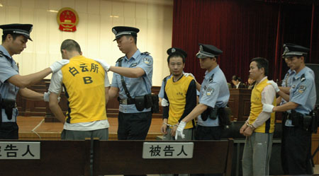4月28日,廣州“瘦肉精”中毒事件后的首起刑事訴訟,在廣州市白云區(qū)人民法院開庭審理,鄧云高等3名被告人被指控涉嫌銷售有毒、有害食品罪。圖為3名被告人被法警帶入法庭。