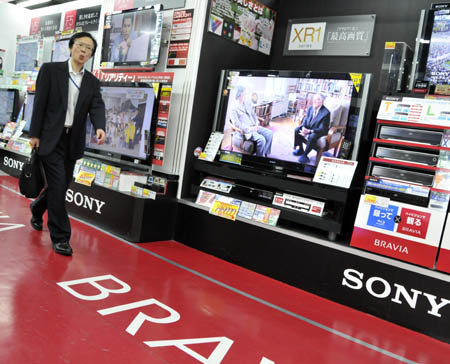 5月14日,在日本首都東京一家商場,一名男子走過索尼公司的液晶電視柜臺(tái)。日本索尼公司14日宣布,該公司在截至今年3月的2008財(cái)政年度凈虧損989億日元(約合10億美元)。這是該公司14年來首次虧損。