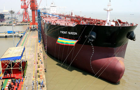 5月18日,萬(wàn)噸超級(jí)油輪靠泊在上海外高橋碼頭。當(dāng)日,由上海外高橋造船公司為挪威建造的29.7萬(wàn)噸超級(jí)油輪“皇后”號(hào)命名交船。至此,該公司已累計(jì)完工交付100艘船,近1650萬(wàn)載重噸。 受國(guó)際金融危機(jī)影響,全球造船業(yè)接單難、交船難已成為世界性的課題。外高橋造船公司自我加壓,降本增效,造船生產(chǎn)呈現(xiàn)出一派繁忙景象。