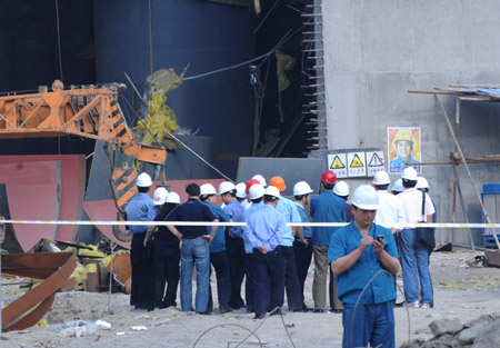 5月19日,事故調(diào)查人員在現(xiàn)場了解情況。 5月18日20時15分,天津市臨港工業(yè)區(qū)渤化永利熱電有限公司在進行煙囪內(nèi)筒安裝作業(yè)時,發(fā)生煙囪內(nèi)筒墜落,造成一起重大安全生產(chǎn)事故,導致現(xiàn)場施工人員12人死亡、11人受傷。事故原因正在調(diào)查中。