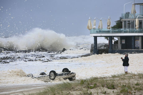 21日,在澳大利亞昆士蘭州的黃金海岸,一名當(dāng)?shù)厝擞孟鄼C(jī)拍攝被風(fēng)浪掀翻的汽車。據(jù)法新社報(bào)道,澳大利亞?wèn)|北部沿海地區(qū)當(dāng)日遭暴風(fēng)雨襲擊,導(dǎo)致數(shù)萬(wàn)家庭停電,數(shù)百所學(xué)校被迫關(guān)閉。